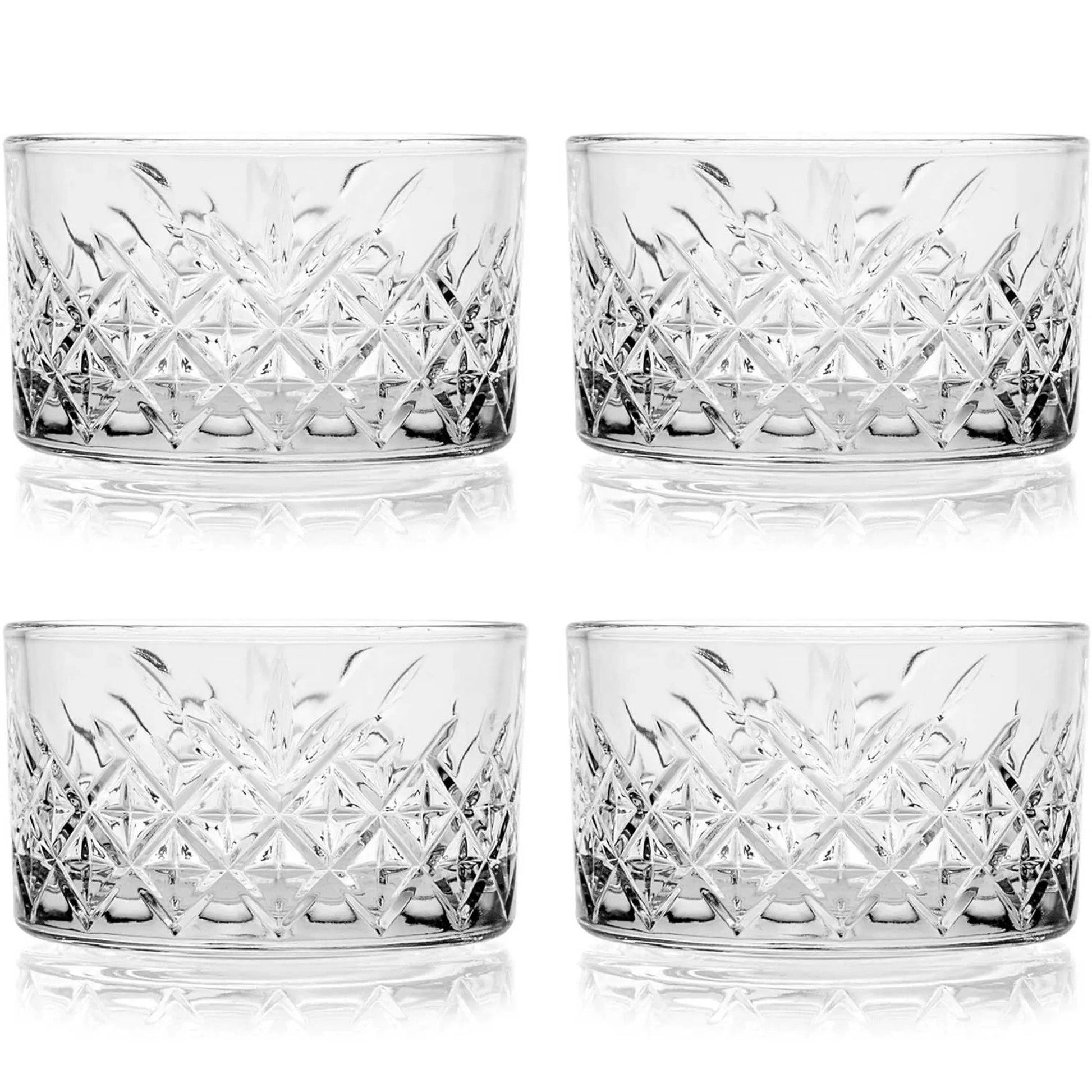 Details:- Inhalt: 4 x Snackschalen, - Optik: Kristall, - Volumen: 225ml, - Höhe: ca. 5,2 cm, - Durchmesser: 8,9cm, - Material: Glas, - Marke: Pasabahce, - Modell: Pasabahce Timeles